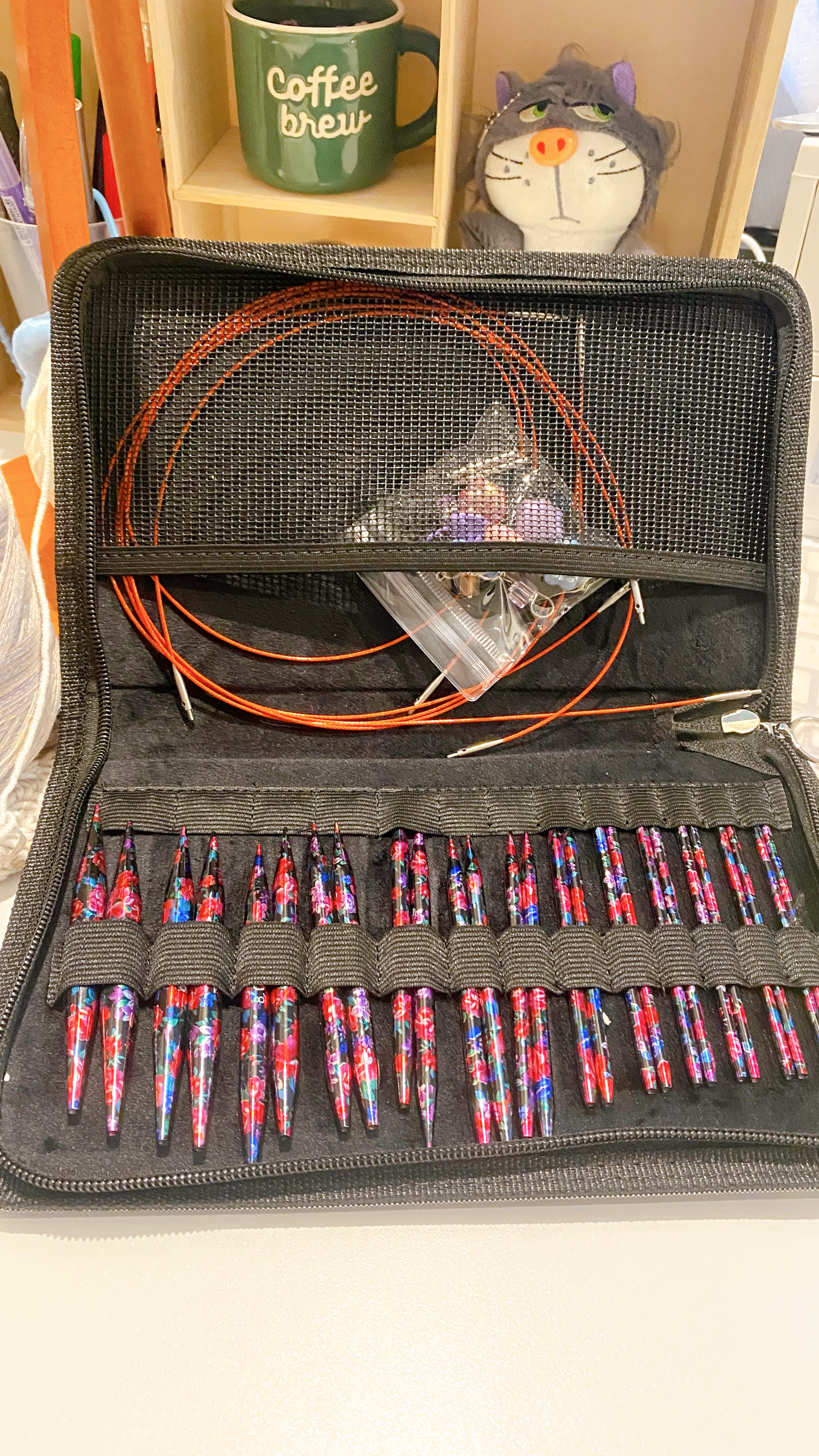왼쪽 사진에서 제일 긴 코바늘이 터니시안이다. 일반 코바늘처럼 사용도 가능하지만 보통 터니시안 기법으로 뜰 때 쓴다. 검은색과 붉은색은 일반적인 코바늘. 갈색이 레이스용이다. 오른쪽 사진은 줄 교체형 대바늘이다. 이번에 테무에서 새로 구입했다. 모양도 이쁘고 뜰 때 촉감이 뽀득하게 부드러워 맘에 든다.